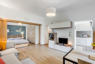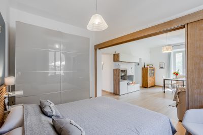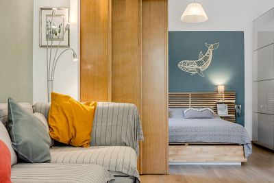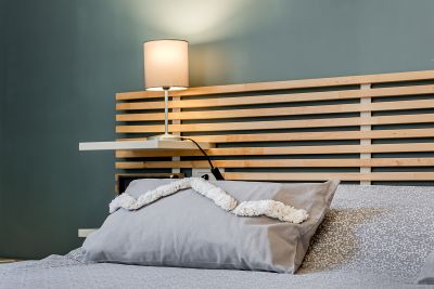 L’espace nuit communique avec le salon, mais peut être séparé grâce à une porte coulissante qui garantit intimité et tranquillité.