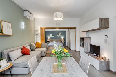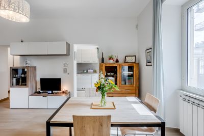 Les intérieurs de Cozy Apartments Rome sont conçus pour offrir un équilibre parfait entre confort et praticité. Le salon est lumineux et accueillant, avec un canapé confortable, une grande table pour les repas et un smart monitor idéal pour regarder des films, écouter de la musique ou travailler. La connexion Wi‑Fi rapide rend l’appartement parfait également pour ceux qui ont besoin d’un espace dédié au télétravail.